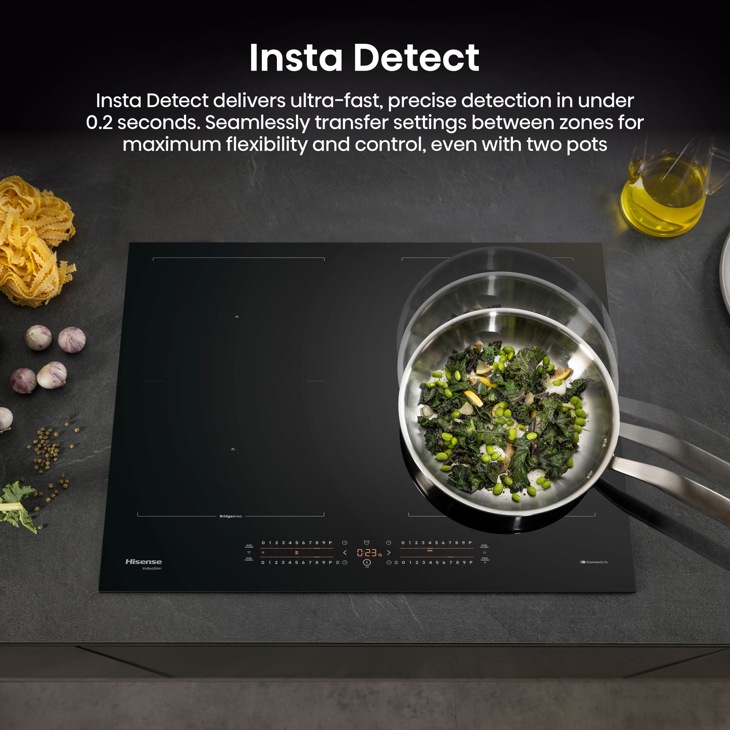 The Hisense Hi6 HI6442BSCWF 60cm induction hob combines cutting-edge technology with effortless cooking. With multi-zone touch sliders, you can easily control each cooking zone with a simple slide, while insta detect recognises your pan in under 0.2 seconds for instant cooking. Gentle heat technology ensures a consistent, even temperature for delicate dishes. Auto programmes, including melt, warm and boil, take the guesswork out of cooking whilst rapid boil provides fast, intense heat when you need it. Area flex allows you to combine two zones for larger pots or multiple pans, offering great versatility. The keep warm function preserves the perfect temperature until you’re ready to serve and recall assist remembers your settings for easy, consistent cooking. Stop & go lets you pause your cooking and resume without missing a beat. Plus, with Wi-Fi Connectivity, you can control and monitor your hob using the ConnectLife app, making cooking smarter and more convenient than ever. Enjoy faster, more efficient cooking with the precise of induction.