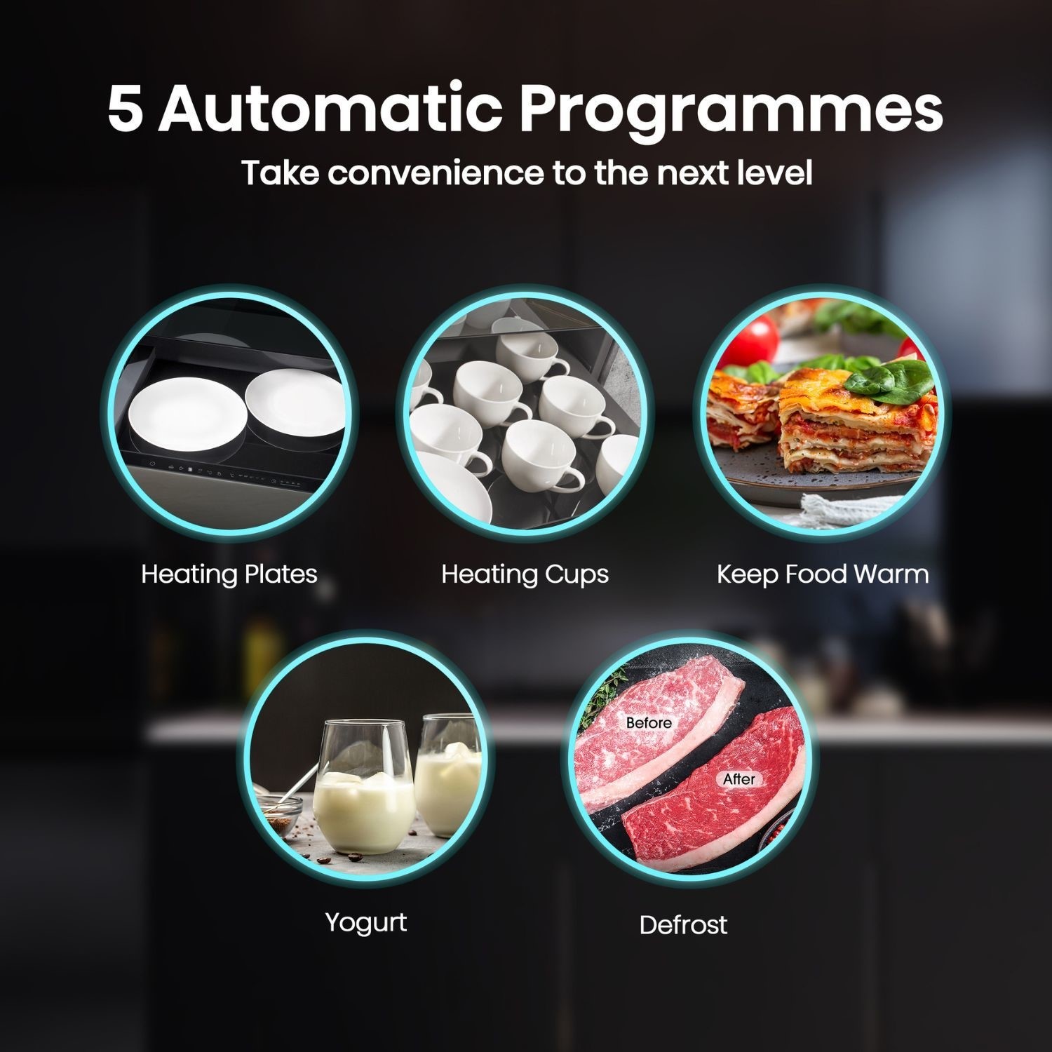 Introducing the Hisense Hi6 BlackLine WDH14BG Warming Drawer which is a versatile kitchen appliance to elevate your cooking experience and simplify your meal prep. With an XL capacity, its perfect for hosting large gatherings or when you simply need to keep multiple dishes warm. Packed with a number of automatic functions which help to take the guesswork out warming. Utilise the defrost function for quick and convenient thawing, whilst have fun with preparing homemade yogurt, perfect for those who like to experiment with different flavours, sweetness and consistency. Designed with a user-friendly interface, with just a few taps, you can adjust temperature, select programmes, set times and much more, ensuring a seamless and enjoyable cooking experience.