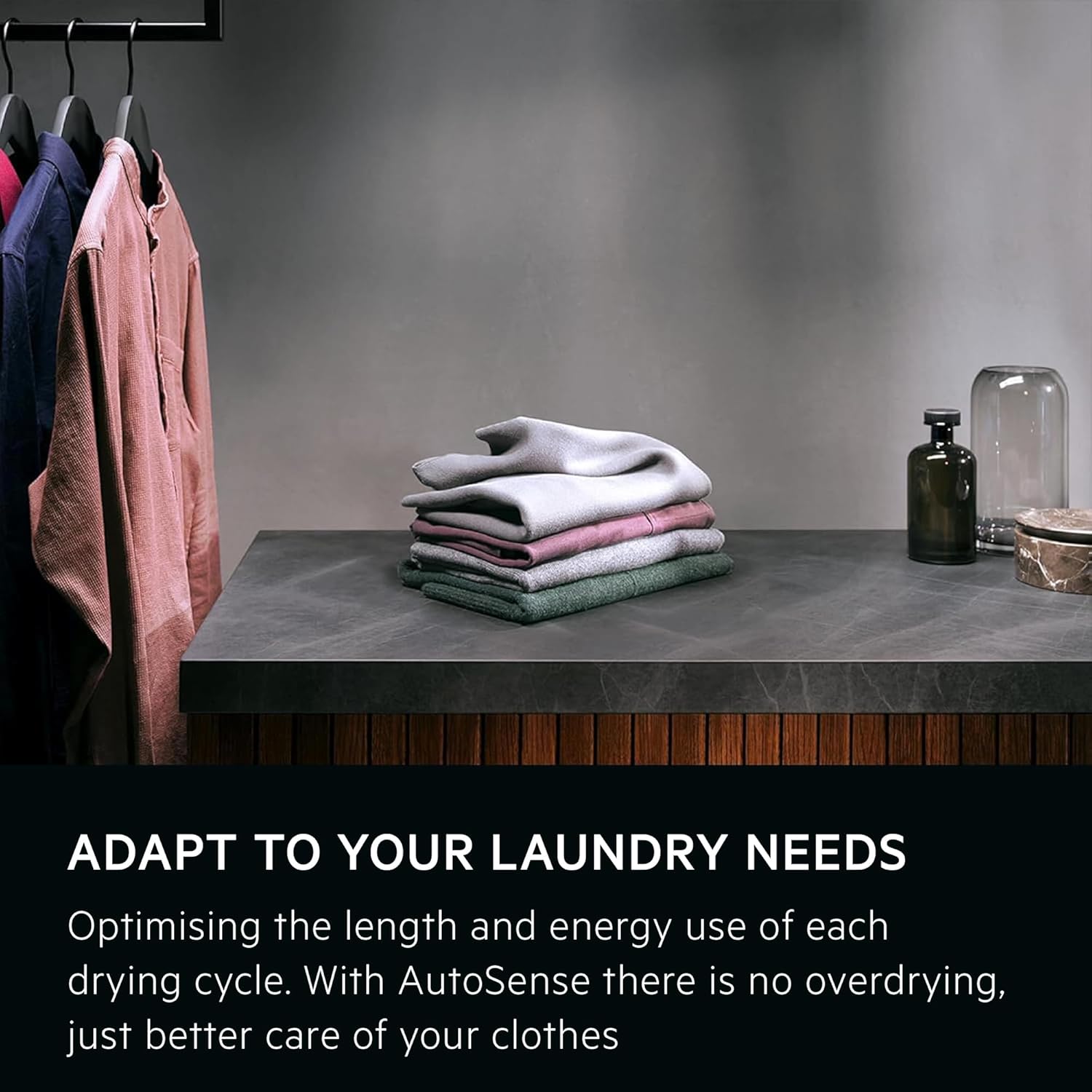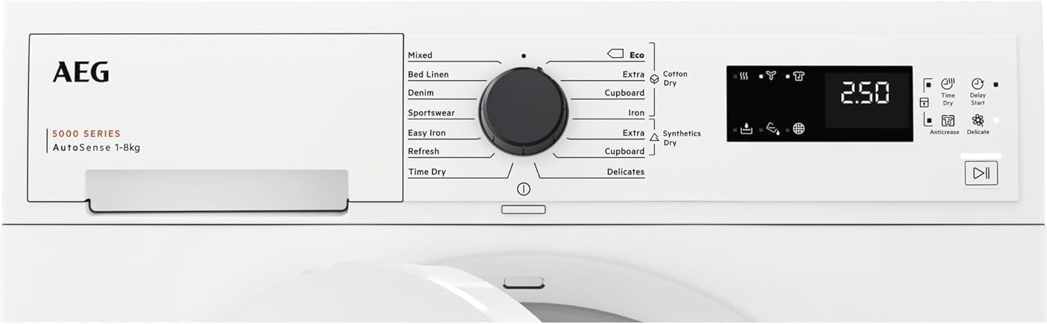 Introducing the AEG TXC508B2B Condenser Tumble Dryer. With an 8kg drum capacity and 14 drying programmes, including specialised options like Delicates and Easy Iron, it ensures tailored care for all fabrics. AutoSense technology optimises drying time and energy usage, while the Anti-Crease option minimises wrinkles. The LED display and rotary dial controls offer intuitive operation, and the reversible door provides installation flexibility. With a B energy efficiency rating and clean filter indicator, it combines efficiency with convenience, promising superior drying performance with every use.