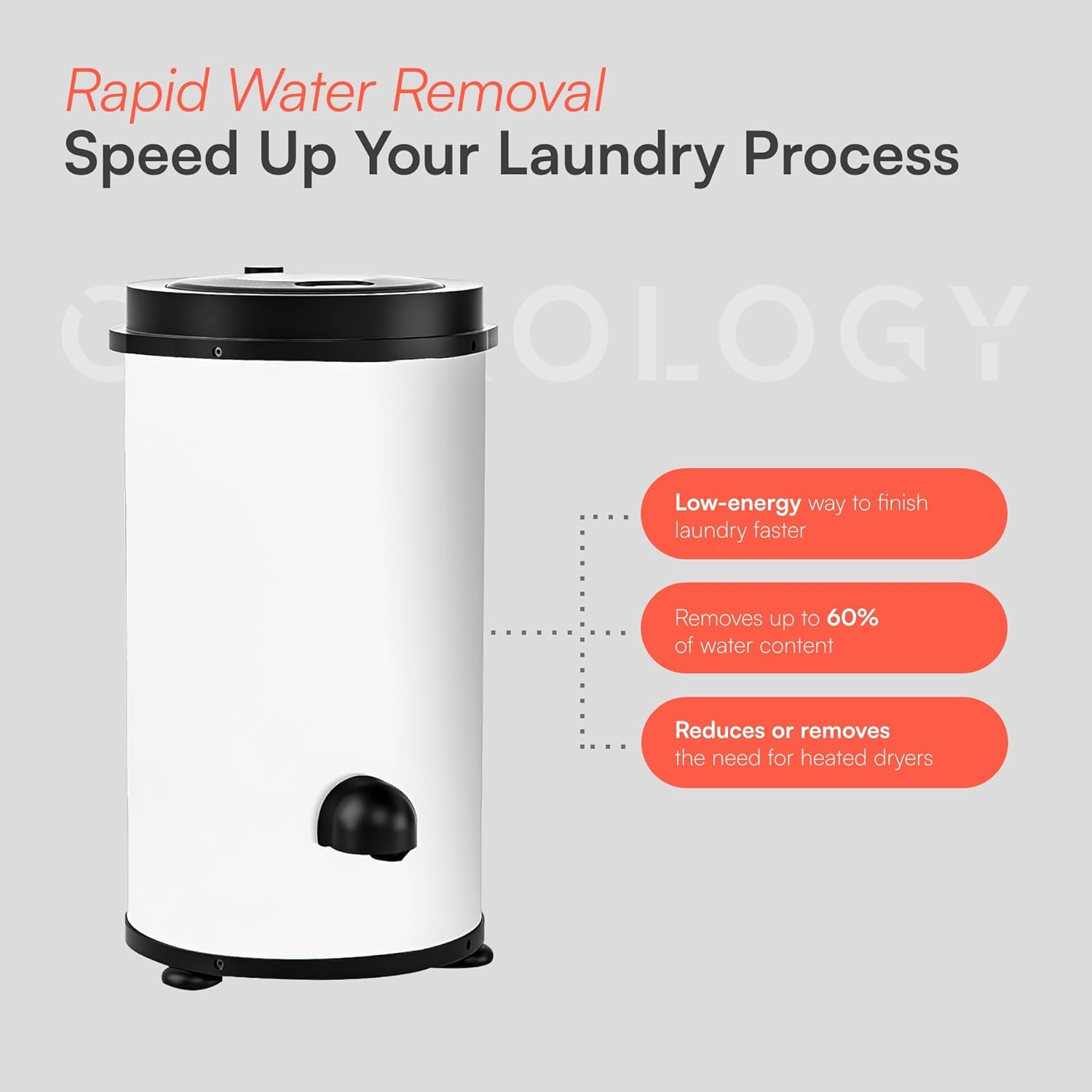 HIGH DEWATERING RATE: Our spin dryer has a high rotation speed that means the drum inside the dryer spins at a maximum speed of 2800 times a minute. This removes up to 60% of the water content of your clothes. The spin dryer helps to speed up the drying process of your clothes to increase efficiency when doing your laundry.
