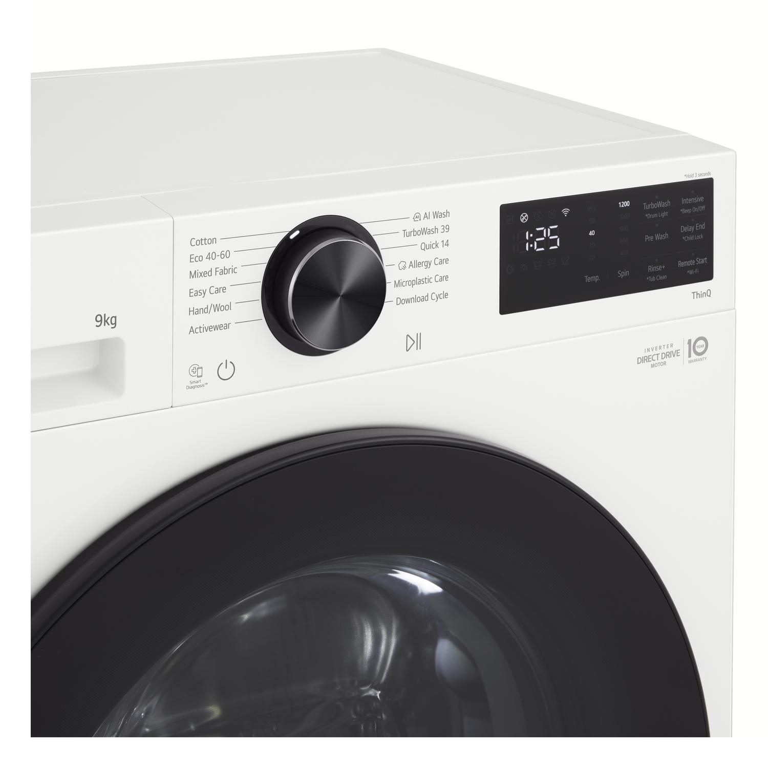 The LG F2X50S9TWB 9kg 1200 Spin Washing Machine in white offers exceptional performance tailored for the modern household. With TurboWash360 technology, users can effortlessly complete a 5kg load in just 39 minutes, ensuring high-quality results every time. This machine also utilises LG's Steam technology, which employs powerful sanitising steam to eliminate allergens by up to 99.99%, fostering a healthier home environment.