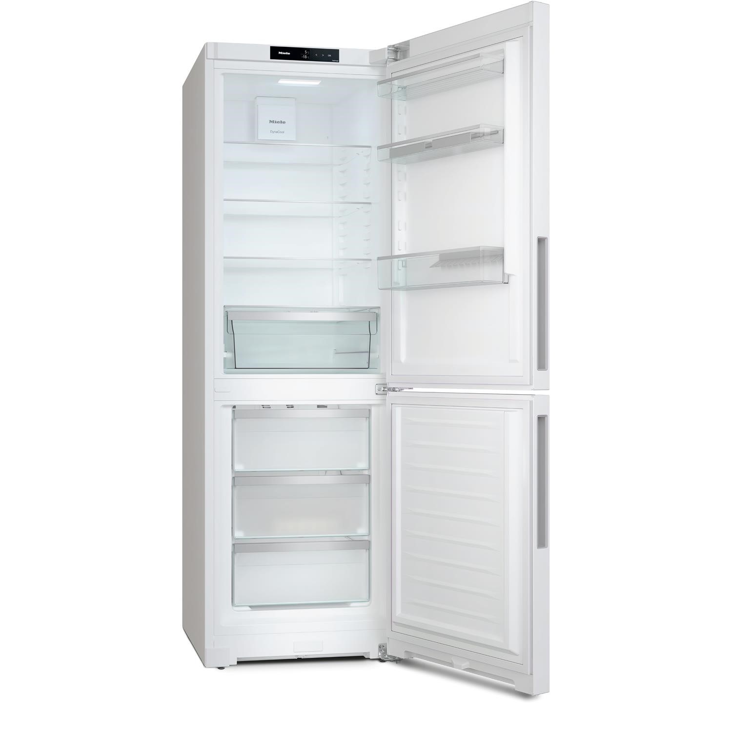 The Miele KFN4375CD-WH fridge freezer offers premium storage with a 227L fridge and 103L freezer, perfect for fresh and frozen essentials. NoFrost technology ensures frost-free convenience, while DuplexCool prevents odours and temperature transfer between compartments. DailyFresh maintains fruit and veg freshness, and ComfortClean door shelves are dishwasher-safe for easy cleaning. With touch controls, adjustable shelves, and SuperFreeze for rapid cooling, this energy-efficient appliance (rated C) delivers reliability. A quiet 35dB operation, reversible door, and sleek white finish make it a stylish, practical choice for any kitchen. Freestanding design with right-hand hinge.