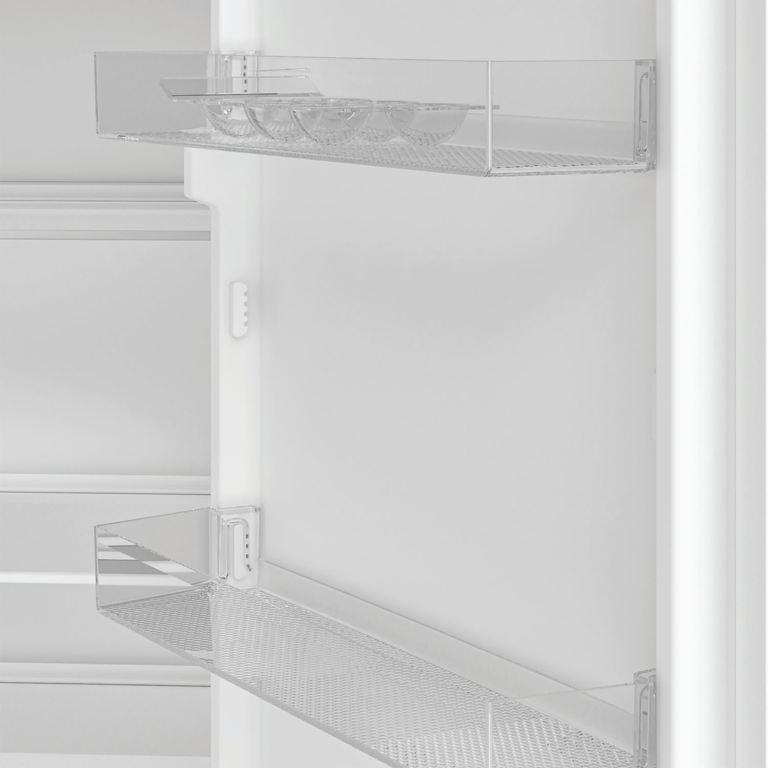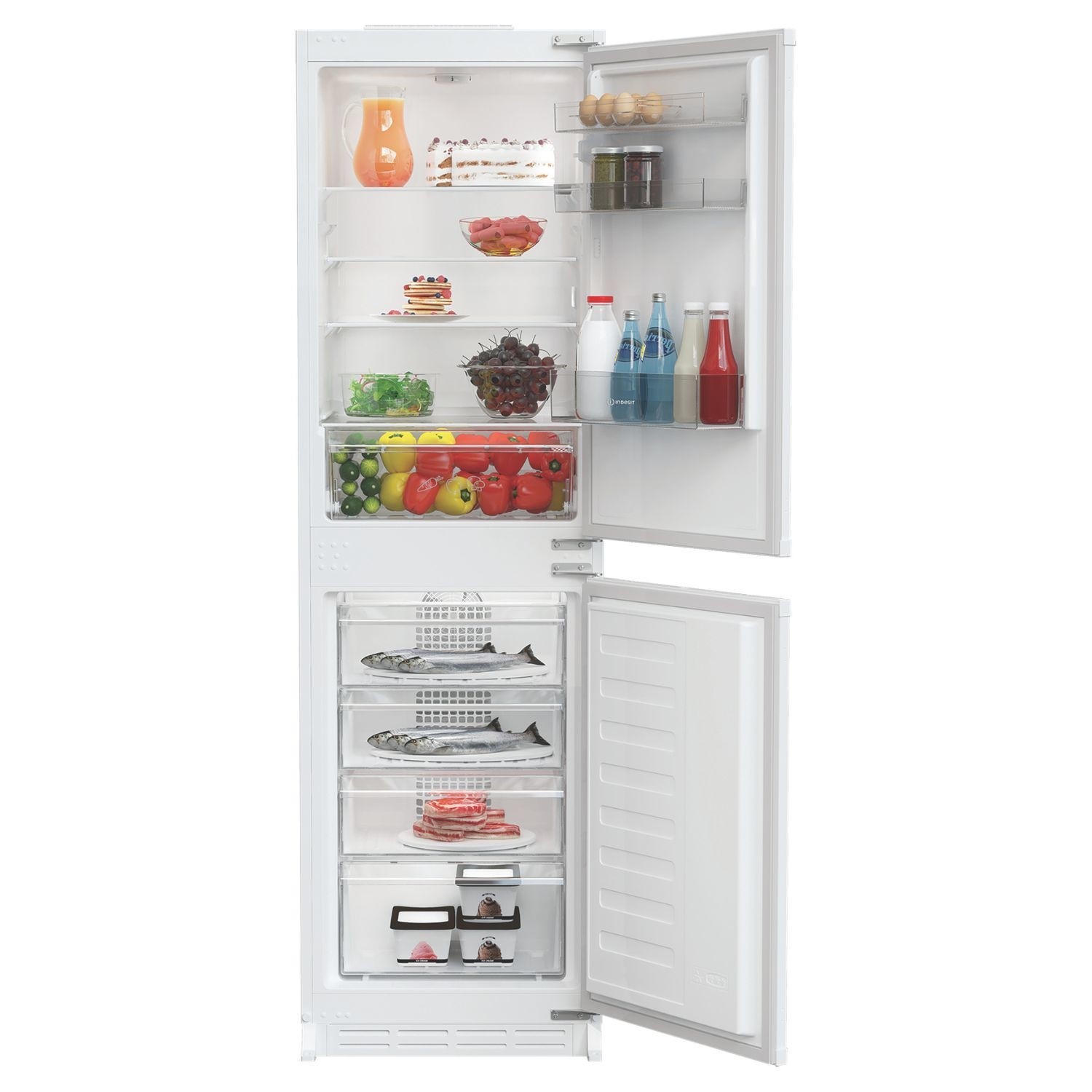 Make storing the weekly shop easier with this Indesit integrated 50/50 fridge freezer. Designed to fit seamlessly into your kitchen, it has a 254L capacity, which gives you plenty of room for up to 14 shopping bags of groceries, allowing for easy unloading after a big shop. No Frost technology means ice can't build up in your appliance, so no more defrosting. Inside the fridge, there's a dedicated Fresh Space that creates the right conditions to keep your fruit and vegetables fresh. Energy-efficient LED lighting also gives you maximum visibility of every shelf and corner. You can even customise your fridge freezer to suit your needs. Flexible inner door balconies and adjustable shelves can create space for tall bottles and larger items, while the reversible door means you can place your appliance where you want. With a noise level of just 37dB(A), this fridge freezer operates quietly in the background without being noticed.