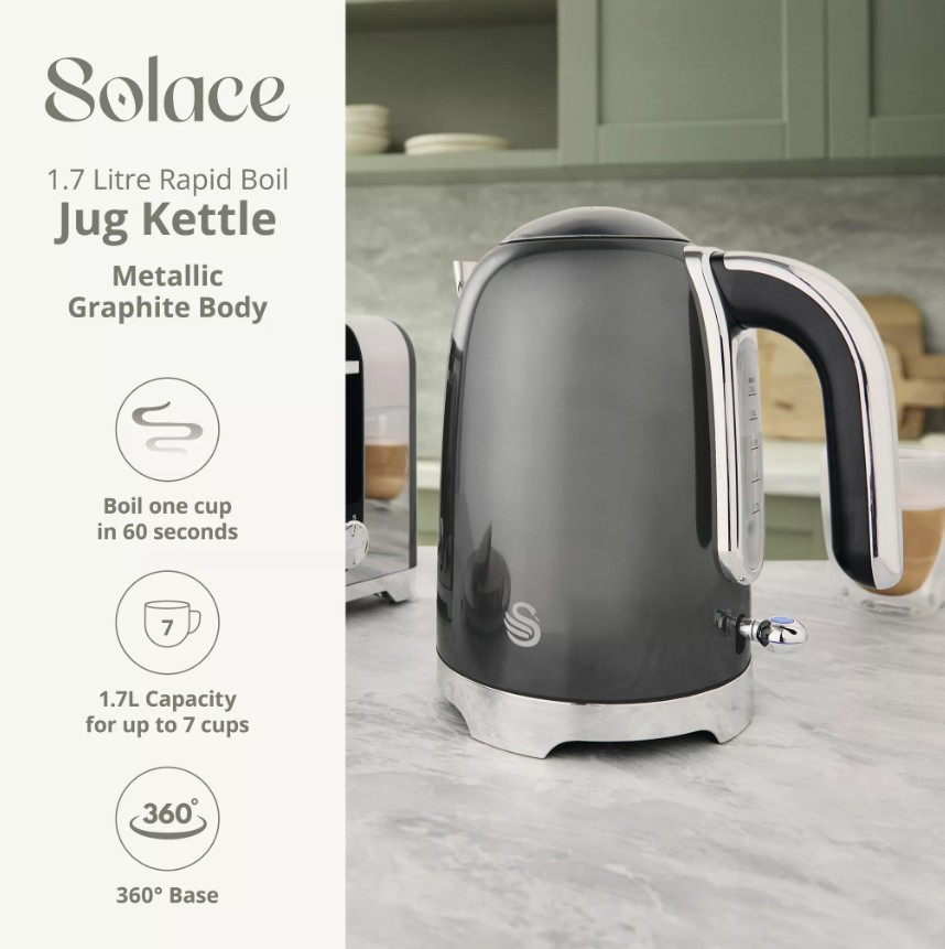 The 3RKW of power in this Swan Solace cordless kettle boils one cup of water in under 45 seconds. Make the perfect drink in minutes, ready to start your day or wind down in the best way possible.