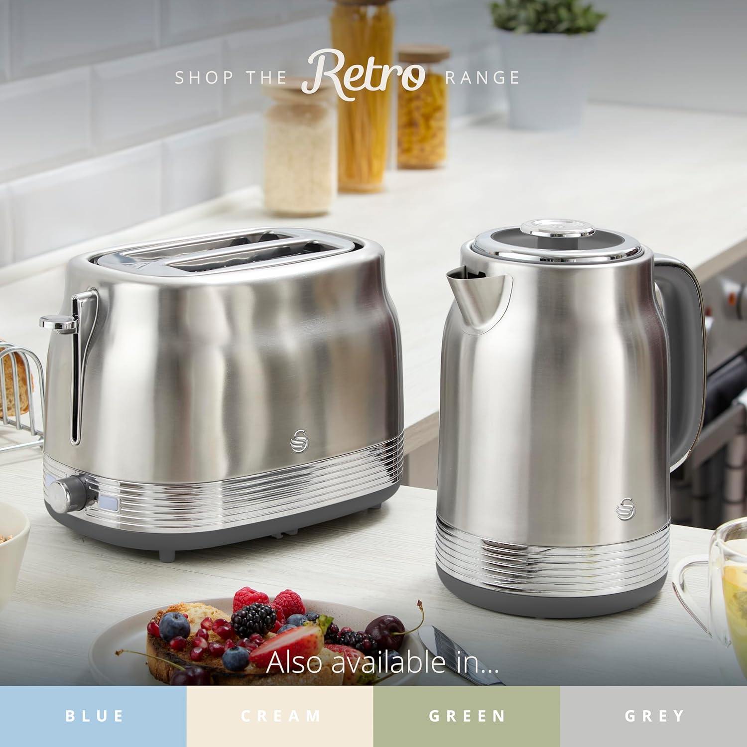 2 SLICE DESIGN: This Swan Retro toaster features 2 variable width slots with a self-centering function. It evenly toasts bread, bagels, breakfast muffins and crumpets of all sizes with the perfect consistency
