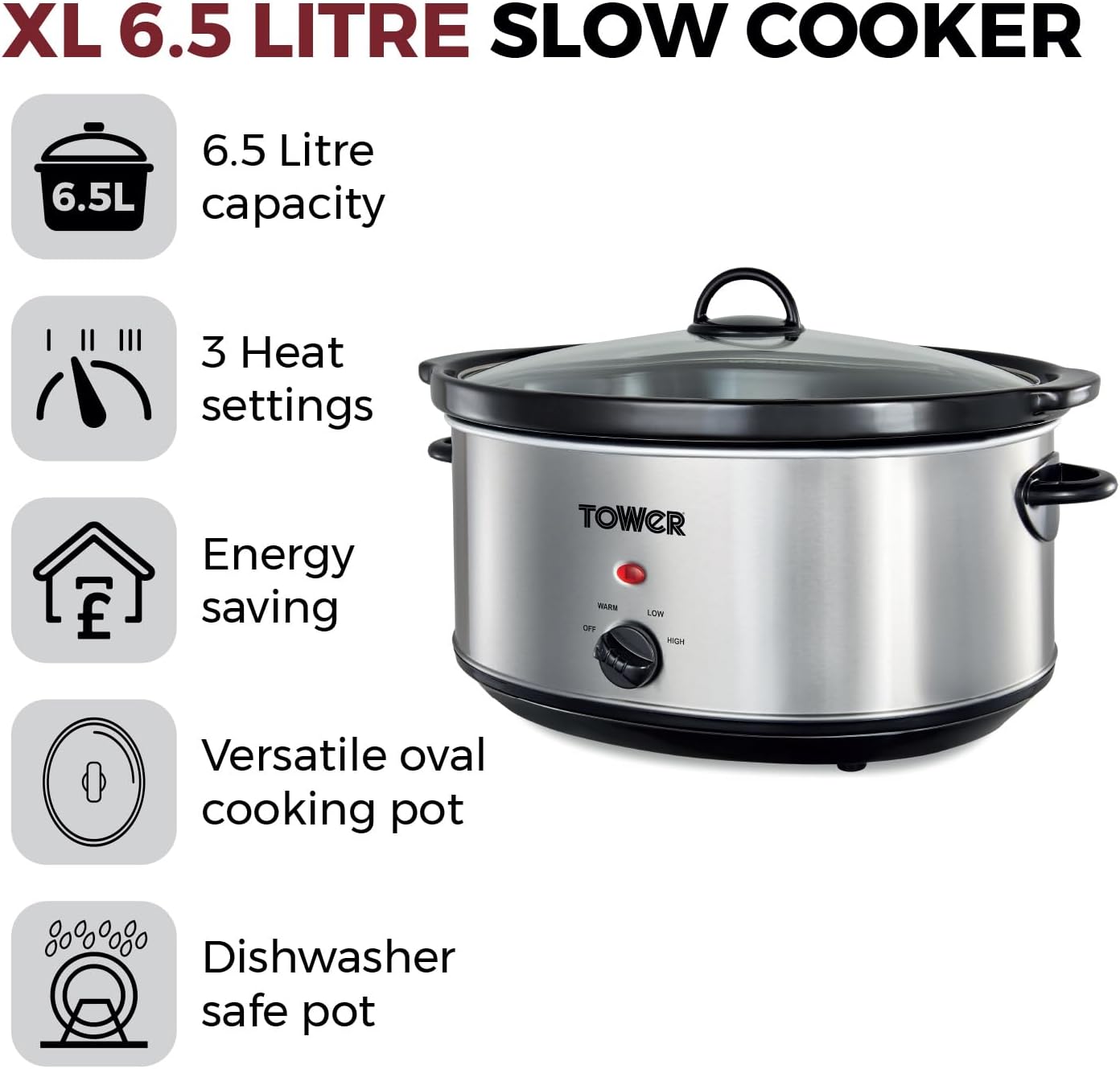 6.5 Litre Slow Cooker 3 Heat Setting In Stainless Steel
